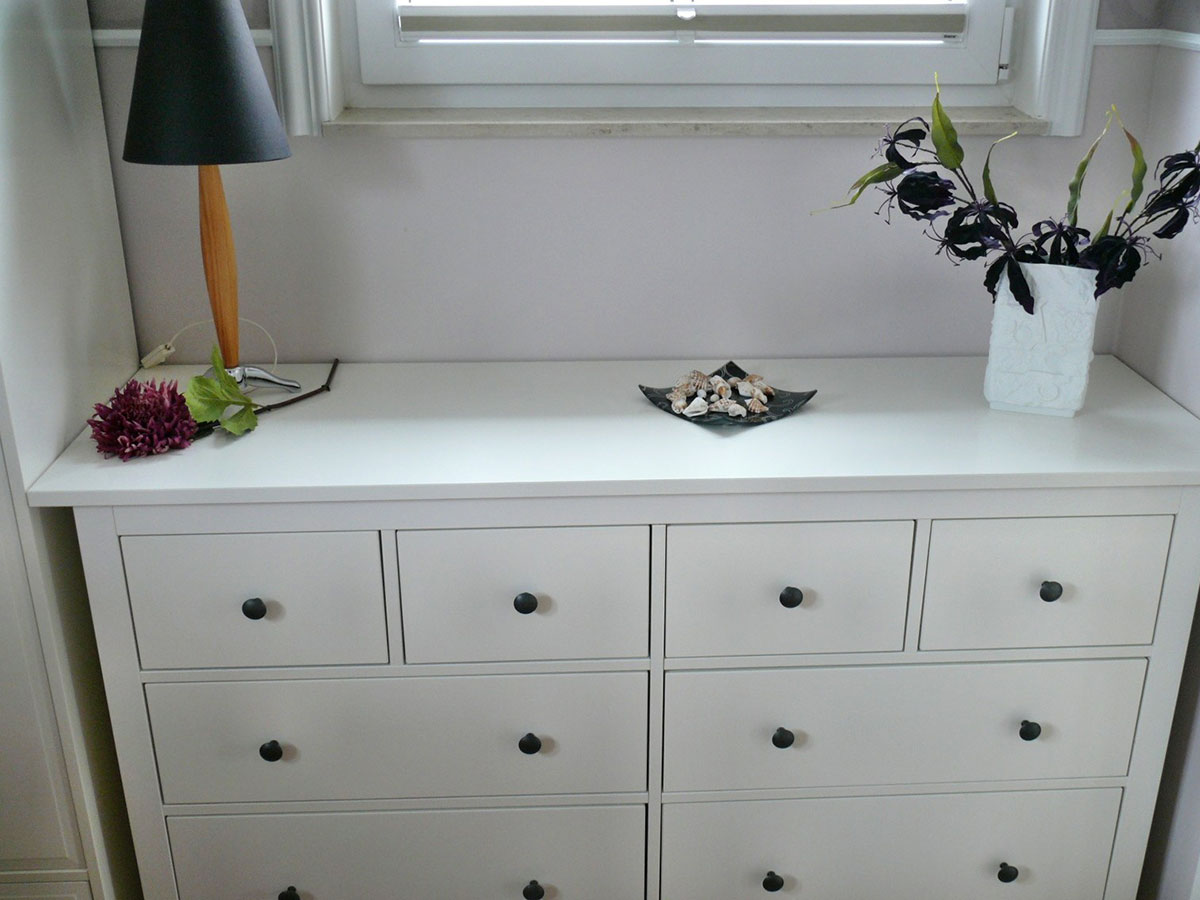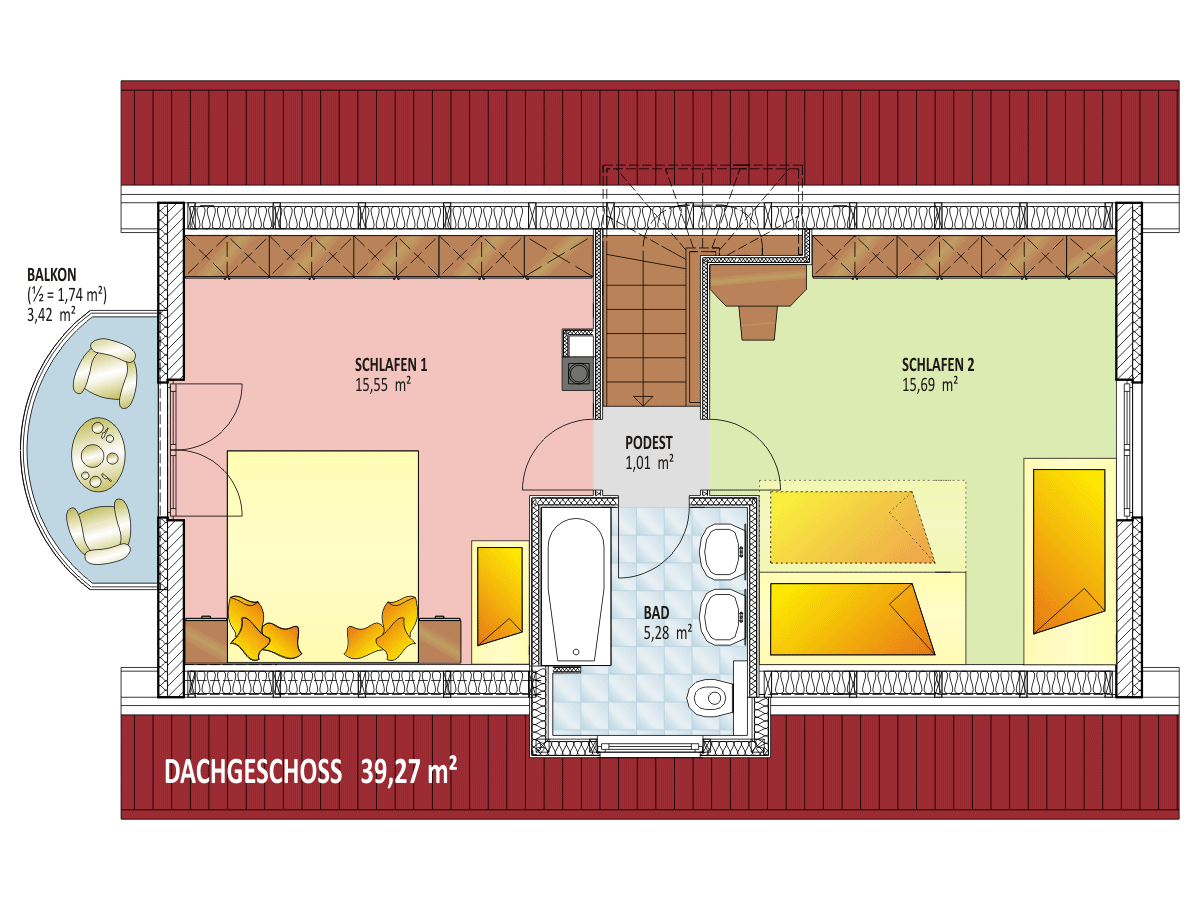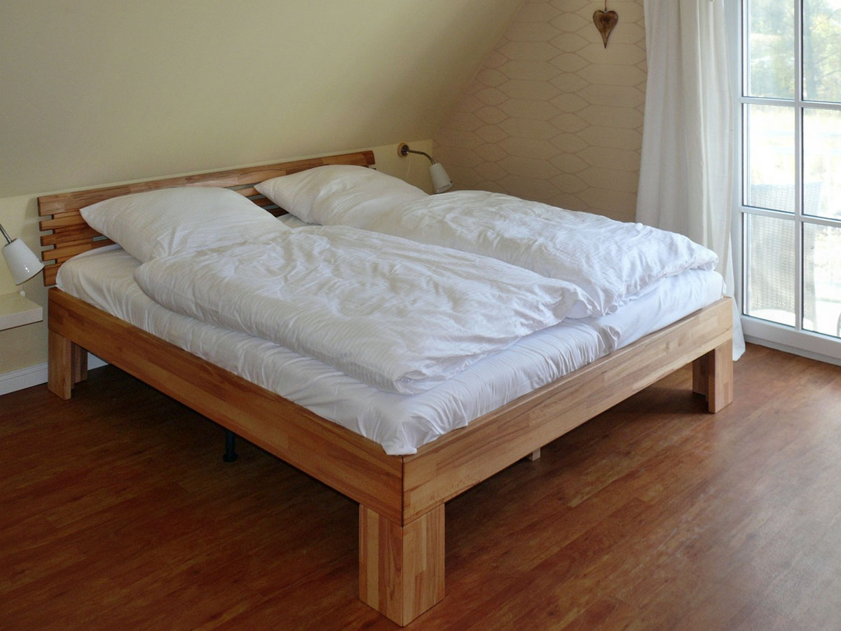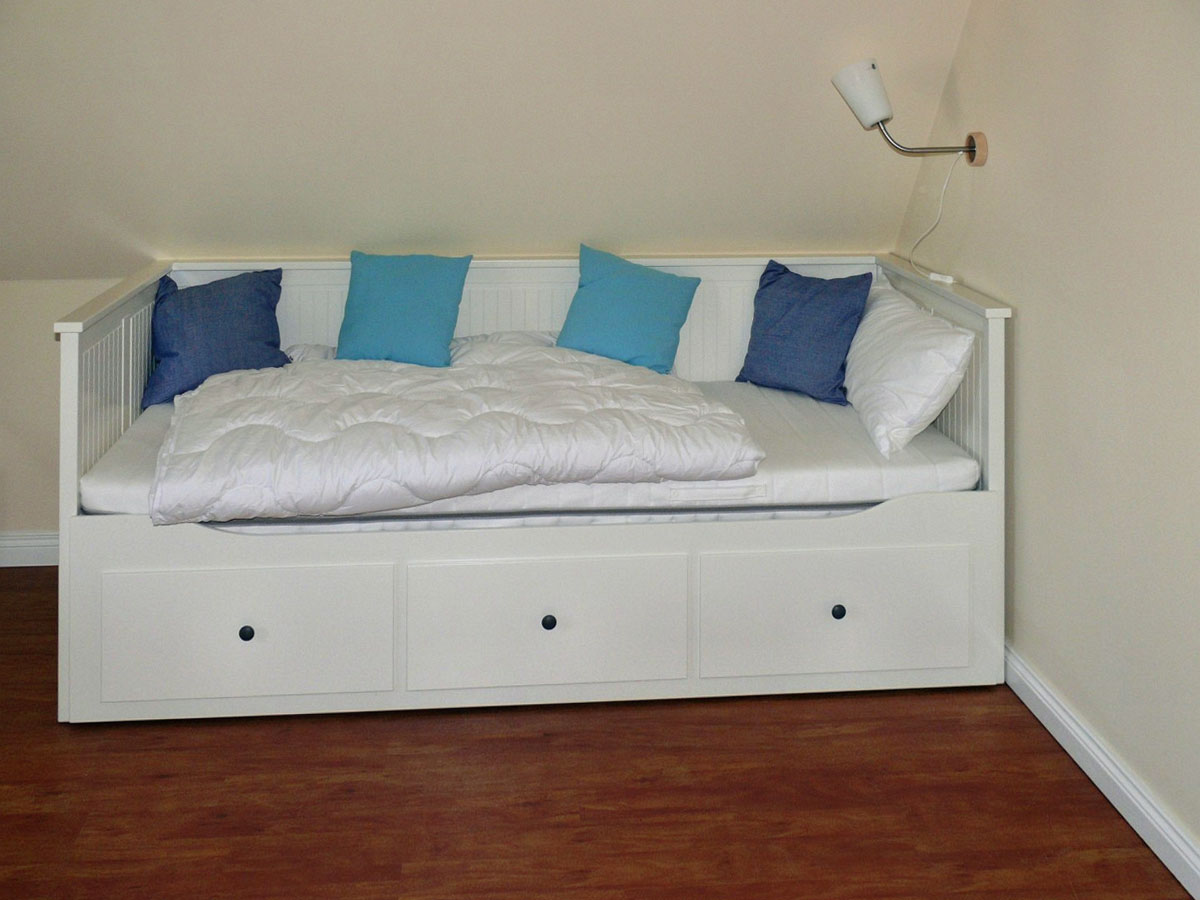 Im Obergeschoss befinden sich ein Schlafzimmer mit Doppelbett und ein separates Kinderzimmer mit zwei Einzelbetten, von denen eins zu einem Doppelbett umgewandelt werden kann. Ein Babybett ist zusätzlich vorhanden. Es wurde insgesamt Wert auf bequeme und qualitativ hochwertige Matratzen gelegt.