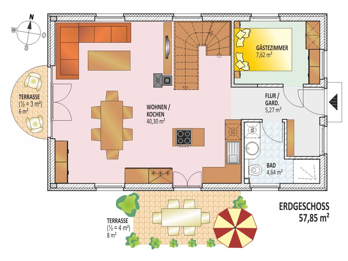 - Bad mit Dusche und WC im Erdgeschoss sowie ein Bad mit Badewanne im Obergeschoss